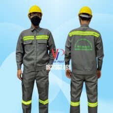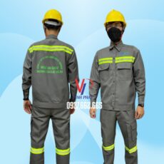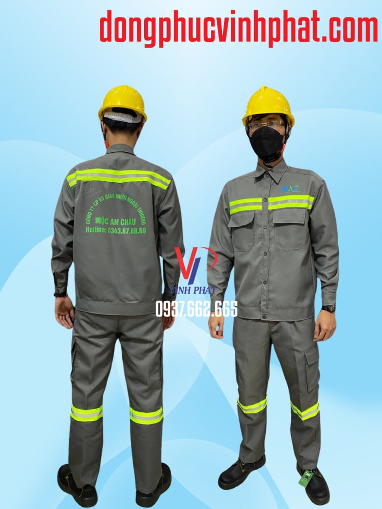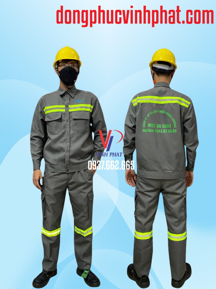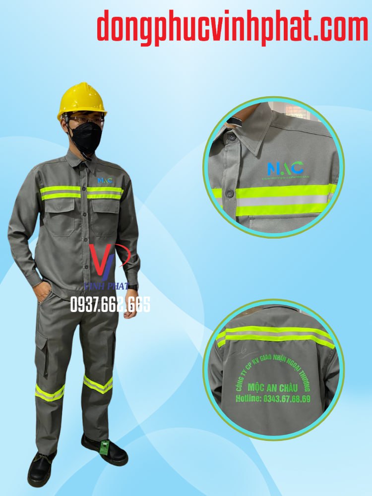 – Mô tả: Thiết Kế & In Logo Trọn Gói – Bộ Công Nhân MAC Xám | Xưởng Nhận May Đồng Phục Công Nhân Phản Quang